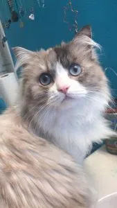 Luna is a Ragdoll Mix with no front claws. She is white with grey markings and blue eyes. She was last seen at Lewis and Clark Elementary in south Farg