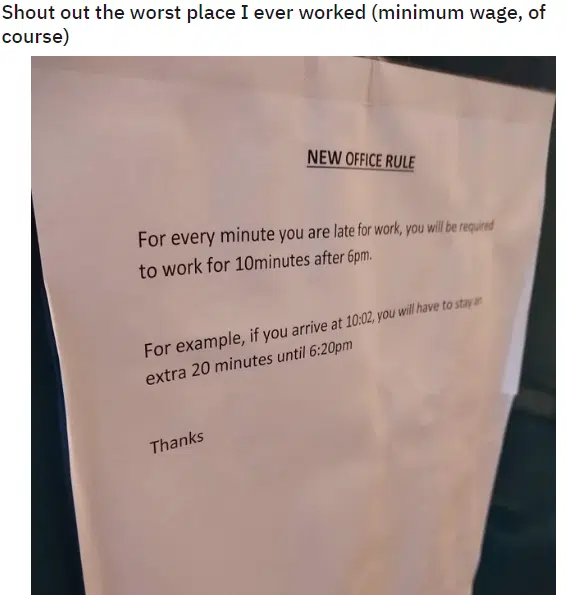 On Reddit posted someone showed a photo of a sign their boss put up announcing a new rule: For every minute you’re late to work, you have to stay an extra ten minutes at the end of the day. For example, if you’re two minutes late, you stay after 20 minutes. The person who posted it said it was a minimum wage job, and they quit and called it the worst place they’ve ever worked.