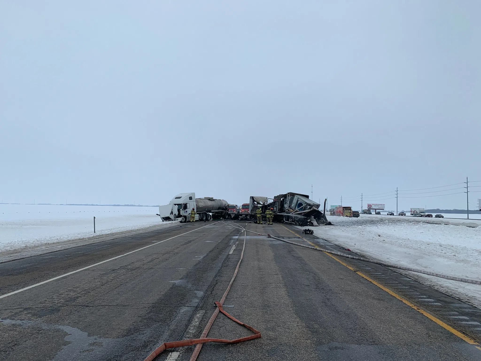 According to State Patrol Capt. Bryan Niewind, around 1:45 p.m., a call came in to report a semi truck in the driving lane either stopped or driving slowly. Several minutes later, another call came in reporting a crash at the same location where the second semi struck the first from behind.