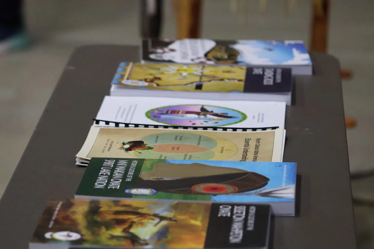 Display copies of updated tribal textbooks detailing the history and culture of the five Native nations that share land with North Dakota. (Mary Steurer/North Dakota Monitor)